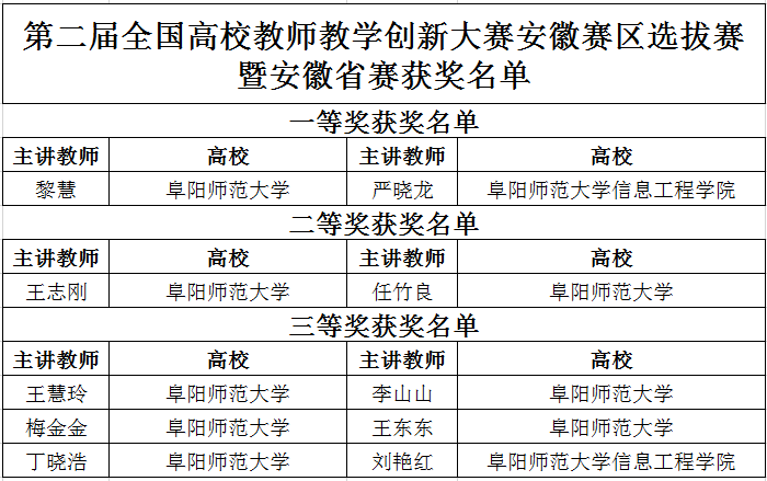 近日,由安徽省教育厅主办的第二届全国高校教师教学创新大赛安徽赛区选拔赛暨安徽省赛圆满收官。本次大赛我校共派出12个教学团队,荣获一等奖2项、二等奖2项、三等奖6项,学校荣获“优秀组织奖”。其中,黎慧团队和严晓龙团队斩获一等奖,并将代表安徽省参加国赛!