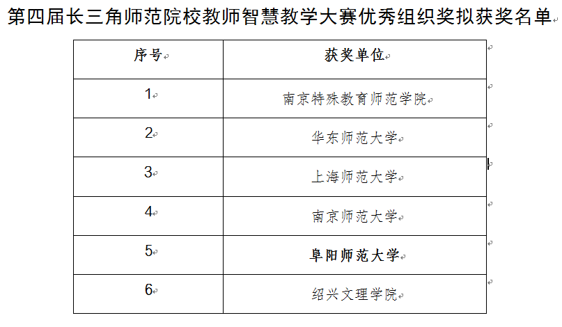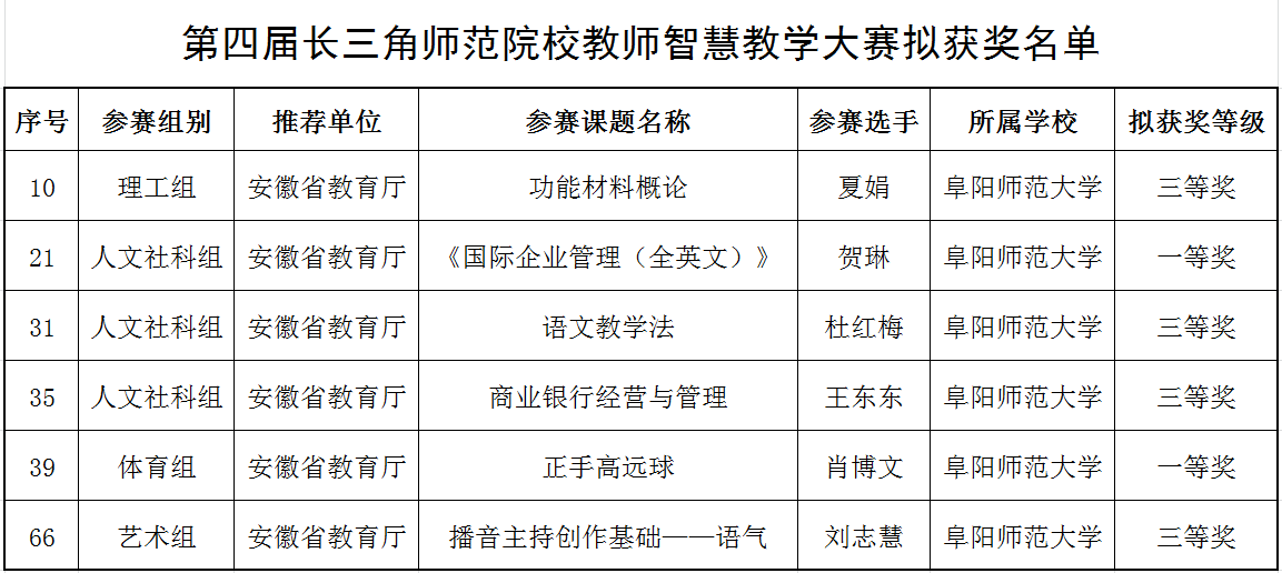 近日,由安徽省教育厅、上海市教育委员会、浙江省教育厅、江苏省教育厅主办,长三角教师教育联盟协办,安徽师范大学承办的第四届长三角师范院校教师智慧教学大赛圆满收官。本次大赛学校推荐参赛的6位教师均获佳绩,取得一等奖2项、三等奖4项。同时,学校荣获优秀组织奖。