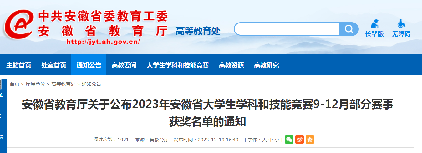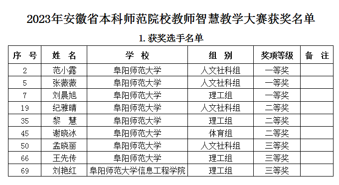 近日,安徽省教育厅公布了《2023年安徽省本科师范院校教师智慧教学大赛获奖名单》,我校教师荣获一等奖3项、二等奖3项、三等奖3项。学校同时获“优秀组织奖”。