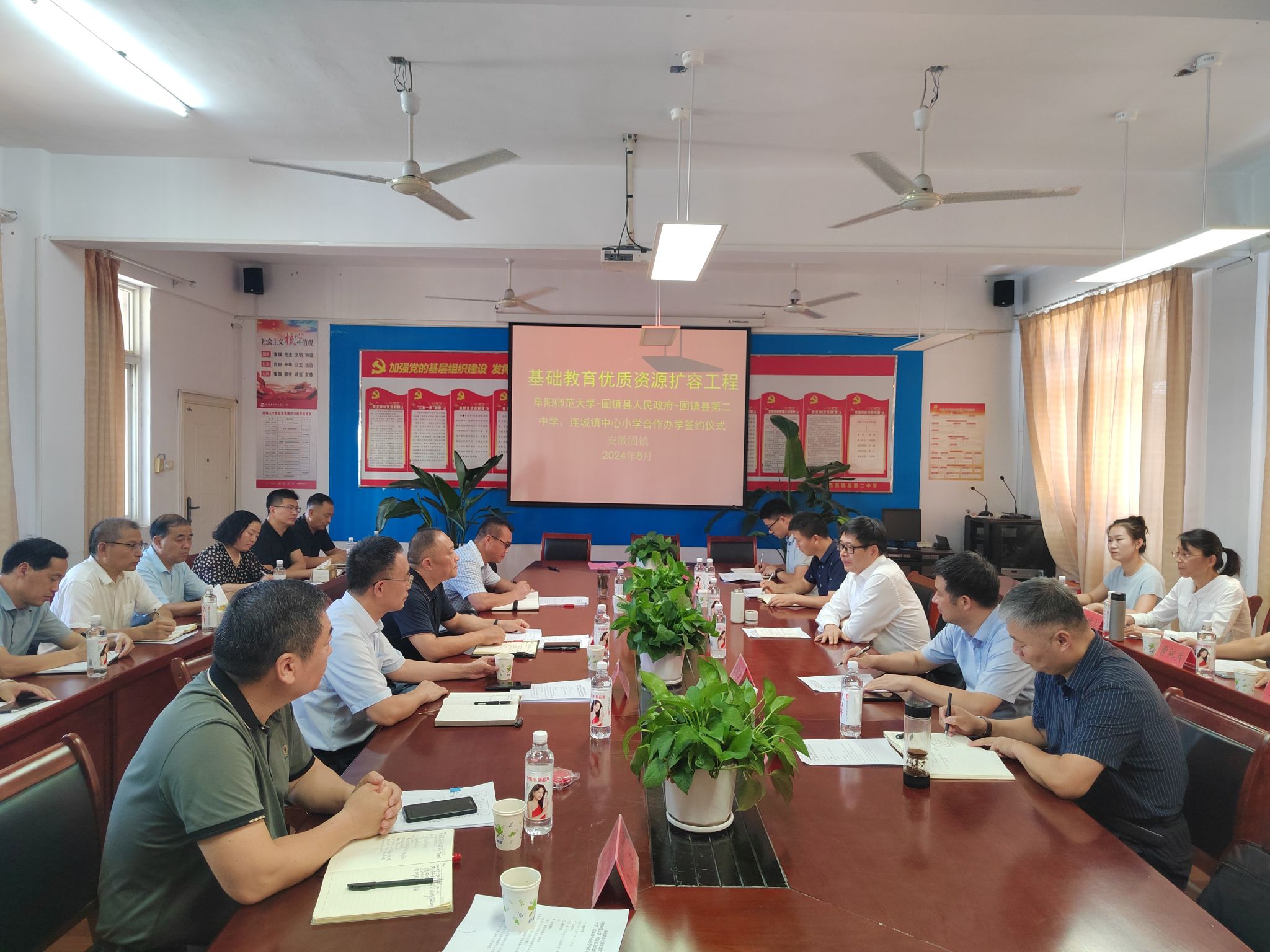 8月5日下午,张庆旭一行在固镇县人民政府副县长戴传捷、固镇县教育局局长陈大保、以及结对合作受援校相关人员的陪同下,逐一考察了固镇县第二中学和连城镇中心小学两所学校派驻团队的生活居住环境,并实地察看连城镇中心小学的校园文化建设情况。在固镇县第二中学与固镇县人民政府、固镇县受援学校签订三方合作协议。