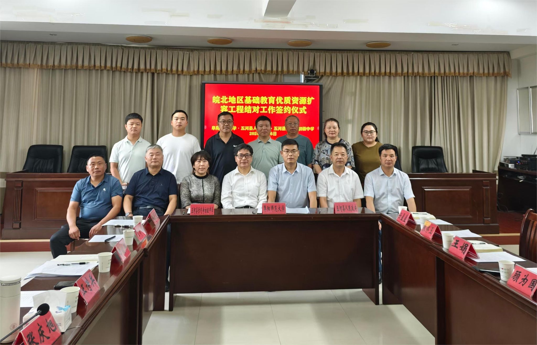 8月6日上午,张庆旭一行先后对五河县弥陀寺初级中学的校园文化环境和派出团队居住条件进行考察。在弥陀寺初级中学校史馆,相关负责人详细介绍了学校的历史沿革和独特的红色文化背景。随后举行我校与五河县人民政府及弥陀寺初级中学合作签约仪式,蚌埠市委教育工委委员、市教育局副局长段元丽,五河县教育局党委书记、局长顾为国,以及弥陀寺初级中学和我校工作人员参加了签约活动,活动由五河县人民政府副县长苏永松主持。