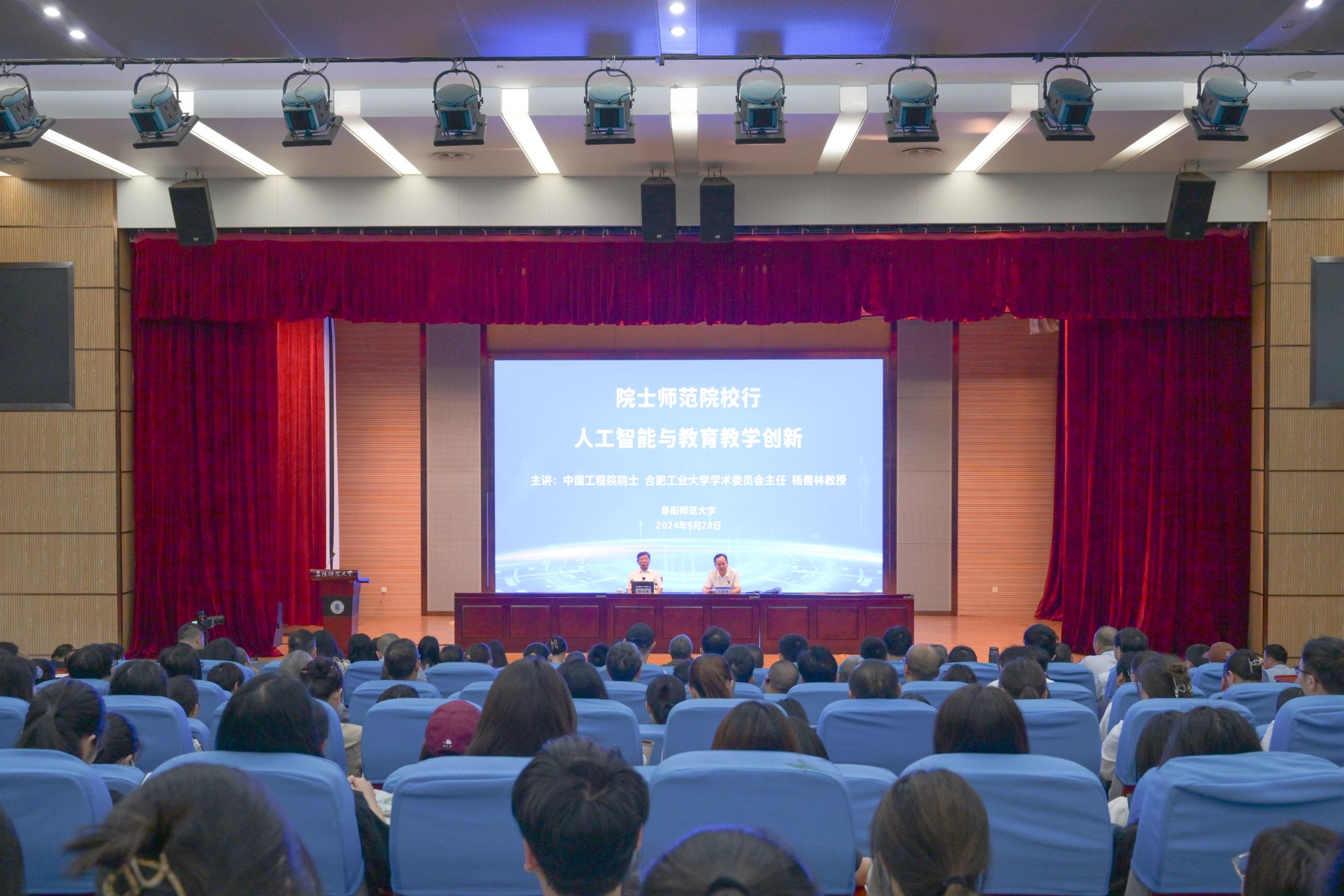 9月28日,由教育部、中国科学院、中国工程院、中国科学技术协会四部门联合主办,阜阳师范大学承办的“院士师范院校行”活动在我校西湖校区举行。中国工程院院士、合肥工业大学学术委员会主任杨善林教授作题为《人工智能与教育教学创新》讲座。校党委副书记、校长方廷勇,校党委常委、副校长张庆旭出席,活动由方廷勇主持。我校600余名师生代表聆听了讲座。