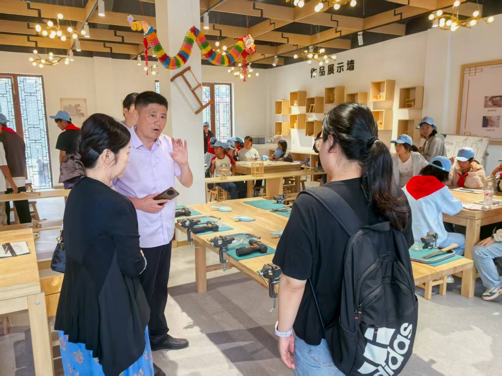 上午,调研团队首先参观了长官镇“动手吖”劳动教育研学基地的各实践教育场馆。基地负责人介绍,该基地通过场馆参观、沉浸式体验和户外拓展等丰富多彩的实践活动,带领学生体会不同职业的工作内涵和价值,每年度接待学生开展劳动教育课程体验达到上万人次。下午,在临泉县幸福路小学调研期间,李晓光校长引导参观了学校实践教育大楼中的各类型美育、劳育教室,介绍了该校“立德树人”、“五育并举”育人成效。考察团队还前往临泉县城南街道一品公馆幼儿园进行调研。双方交流会议中,充分了解到目前该幼儿园在劳育课程建设和管理、评价标准等方面的技术需求。