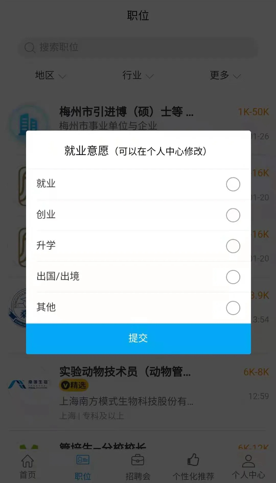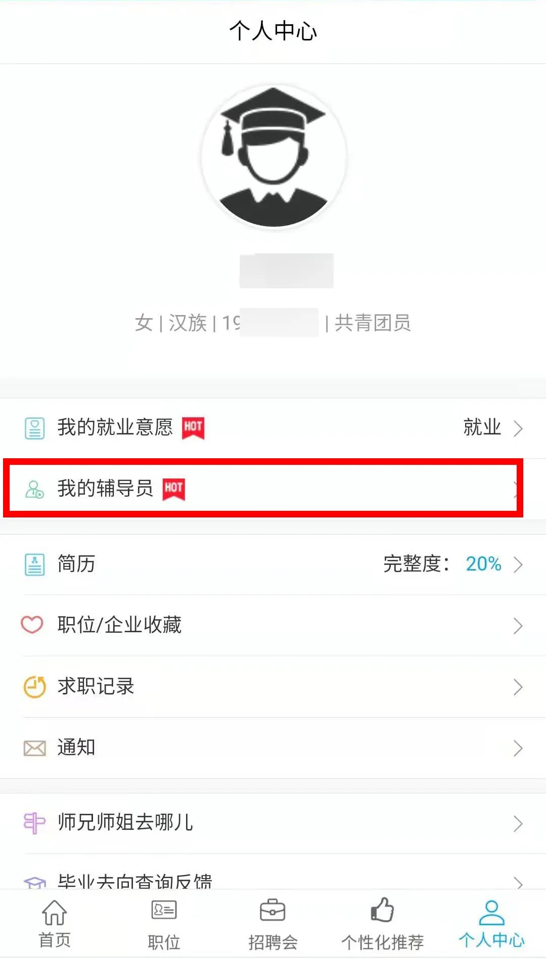 4.绑定成功后,自动回到个人中心,应届生首次登录须先登记就业意愿,选择后,在个人中心列表上点击“我的辅导员”。