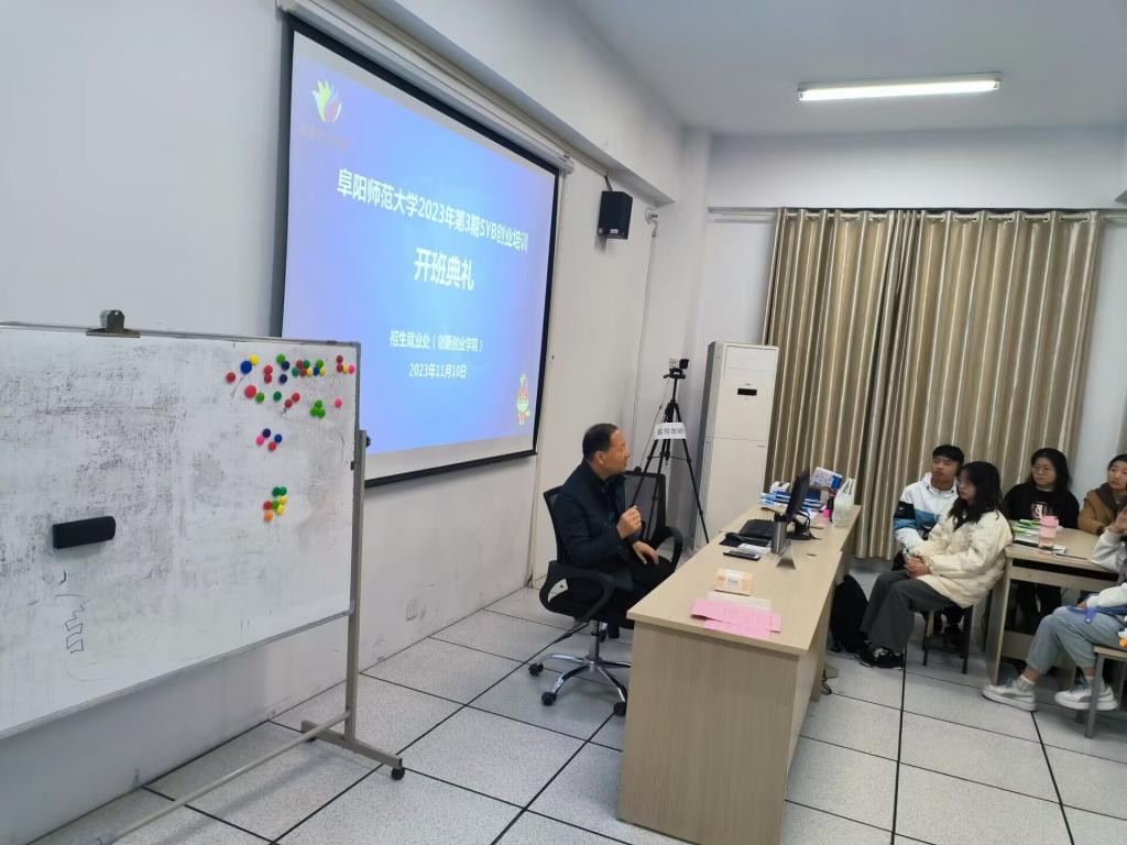 为加深同学们对创业项目,创办企业知识的了解,提升创业信心、回避创业风险的意识。创新创业学院于2023年11月10日开办2023年第三期“创办你的企业(SYB)”创业培训班,开班典礼在汉风楼B楼215创业培训教室举行。本期SYB培训从11月10号开始到11月26号结束,共分2个培训班,每个班30人。培训讲师李国强、徐朝东、观摩老师张桃及59名培训学员参加开班典礼,创新创业学院宁静主持开班典礼。