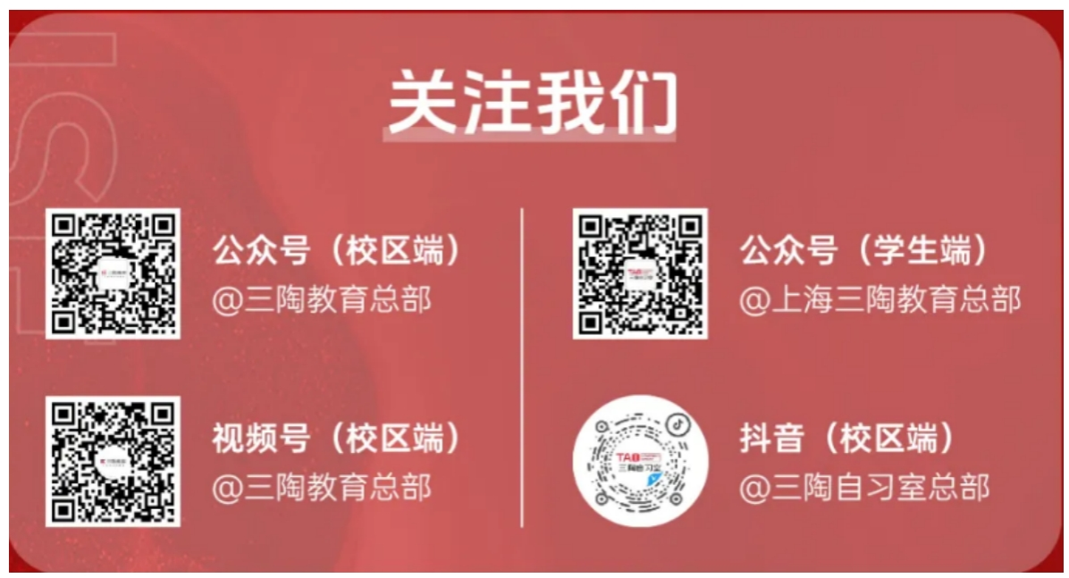 •关注企业公众号:扫描下方二维码,关注“三陶教育总部” 公众号(校区端)、“上海三陶教育总部” 公众号(学生端),或 “三陶自习室总部” 微信公众号,获取最新校招宣讲会信息,现场投递简历更有机会直接与 HR 面对面交流;