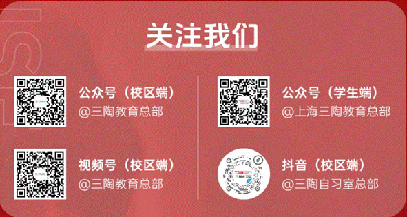•关注企业公众号:扫描下方二维码,关注 “三陶教育总部” 公众号(校区端)、“上海三陶教育总部” 公众号(学生端),或 “三陶自习室总部” 微信公众号,获取最新校招宣讲会信息,现场投递简历更有机会直接与HR面对面交流;