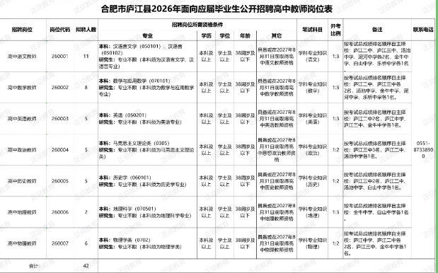 本次招聘计划为42名。具体岗位及条件详见《合肥市庐江县2026年面向应届毕业生公开招聘高中教师岗位表》(附件1)。
