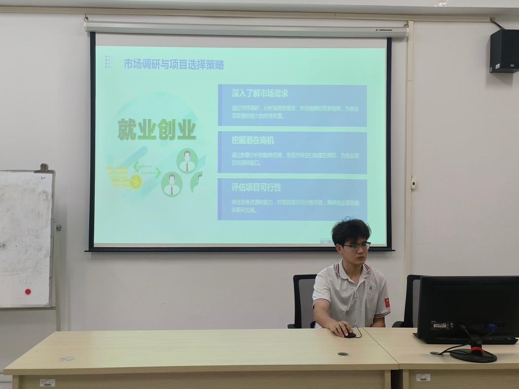活动第二项,讲解青年创业的准备工作。创业要有明确可行的方向,能够制定详细理智的计划,知道有用武之地的能力和转瞬即逝的时机。青年创业要做到深入了解市场需求,通过市场调研,分析消费者需求,市场规模和竞争格局,为创业项目提供有力的市场支撑,学会挖掘潜在商机以及评估项目可行性。随后主持人播放相关就业创业视频,同学们都积极观看思考。