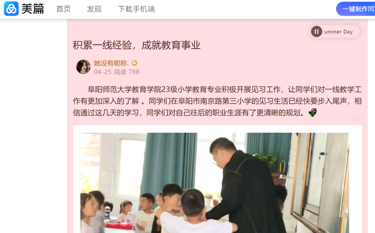 4月22日至27日,2023及小学教育(师范)专业学生分组前往实践基地,进行为期一周的“学校现场观摩,开展师德体验”教育见习活动,不仅提升了学生们的专业素养和实践能力,也坚定了他们投身教育事业的决心和信念。见习生深入校园,亲身参与升旗仪式、观摩课堂教学,听取校长讲座和师德讲座、协助批改作业、参与延时服务等环节,全方位体验了教师的工作内容和职责。他们认真观察,虚心学习,获得了实践基地的高度认可。西湖镇华佗小学的负责人表示,见习们展现出了谦虚、好学、懂礼的优秀品质,工整笔记和高素质令人印象深刻。多名学生还自发在自媒体上发布了见习图文。