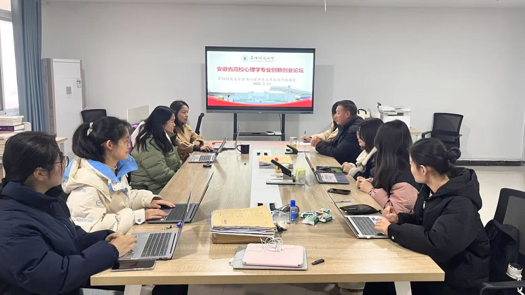 2025年2月23日上午9:00,我院心理学教研室在Z楼509会议室举办了“安徽省高校心理学专业创新创业论坛-阜阳师范大学应用心理学专业学生校内选拔会”。此次选拔会旨在为即将到来的省赛选拔优秀项目,并进一步提升应用心理学专业学生的创新能力和实践水平。