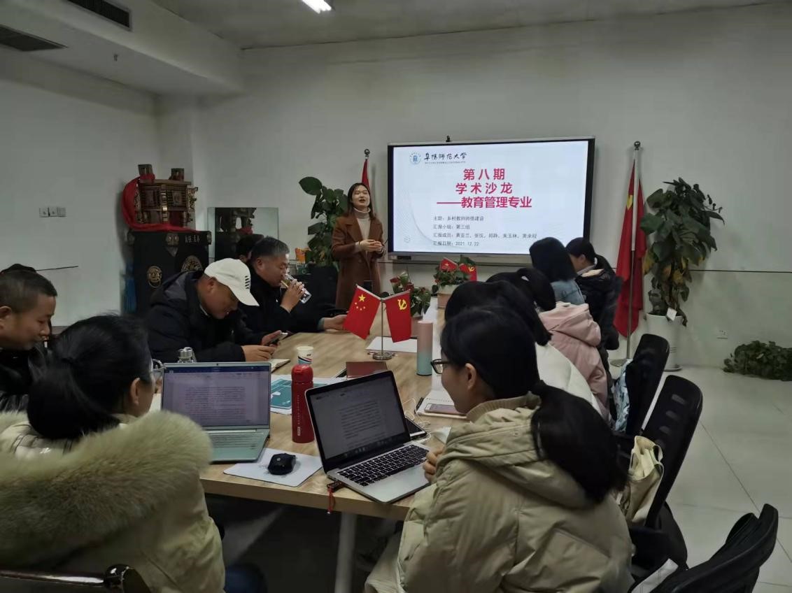12月22日晚,教育学院研究生第八期学术沙龙活动在景行楼802会议室成功举办,此次沙龙主题为“乡村教师师德建设”。阜阳市颍州职业中学德育中心主任,高级教师吴华山,教育学院硕士生导师王健、汪杰锋、张中原以及全体2021级教育管理专业研究生参与此次活动。