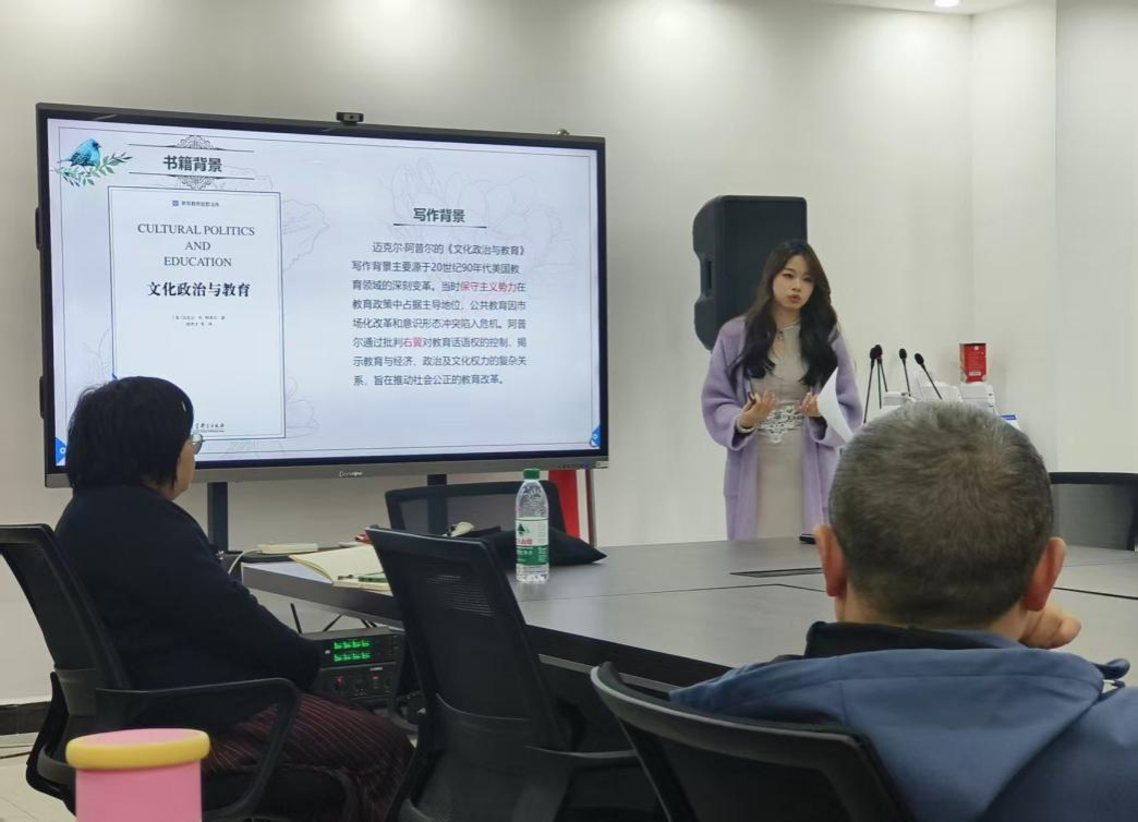 小学教育专业研究生刘梦瑶围绕阿普尔的《文化政治与教育》,深入剖析了文化政治经济之间与教育的内在联系。以及在时代背景下,霸权主义是如何通过国家课程、考试和共同文化影响到教育公平。在交流环节,同学们结合阿普尔对教育市场化的观点,认为其会加剧阶层分化,大家进一步关联中国教育现实,民办教育的多元发展、教育信息化进程中区域与群体间的资源分配不均等现状,共同追问教育市场化在中国的合理边界应如何界定。