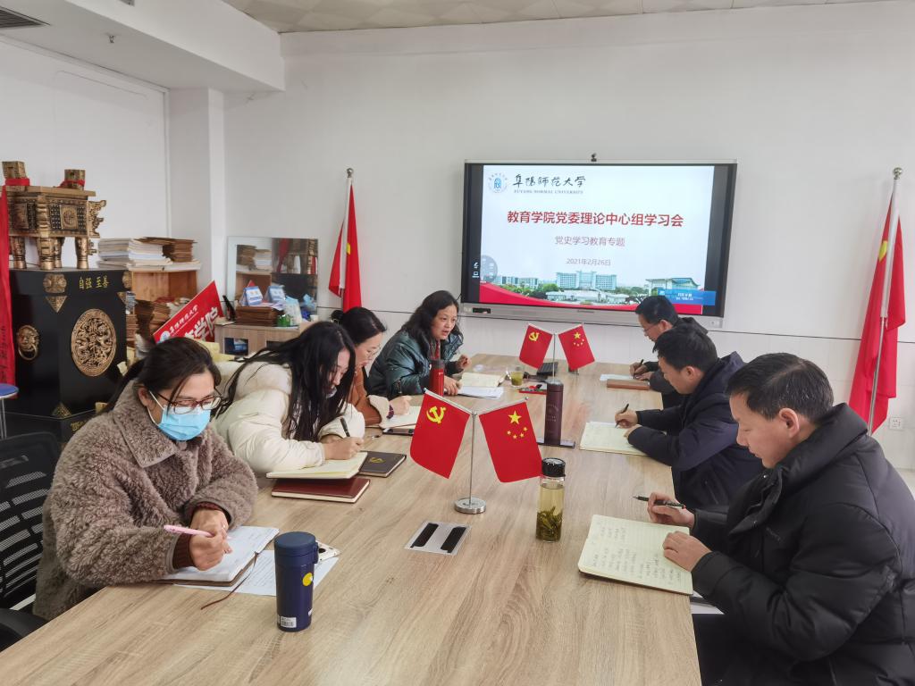 2021年2月26日,教育学院党委在景行楼802会议室召开党委理论学习中心组学习会,专题学习习近平总书记关于开展党史学习教育的重要讲话。学院党委委员、党支部书记参会。