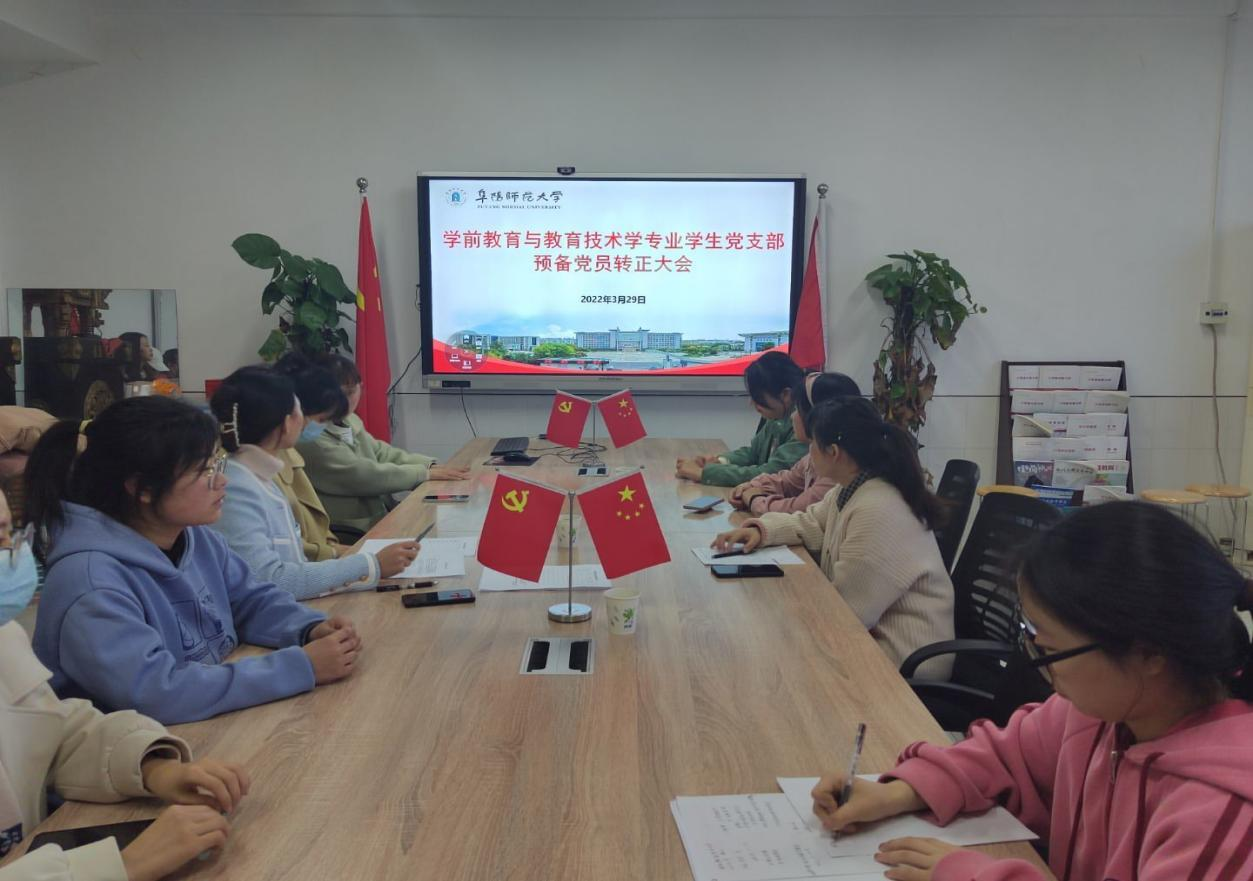 2022年3月29日下午,我院学前教育与教育技术学专业学生党支部在主楼802召开预备党员转正大会。会议由支部书记李佳丽主持,支部全体党员参加。