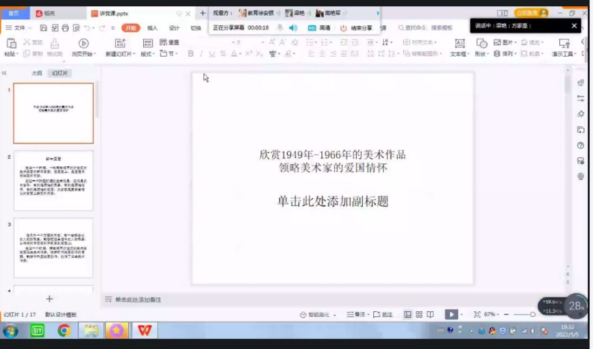 教育系教师党支部自2021年制定“人人讲党课”活动开展以来,坚持一年有余。本次党课主讲人为张文纨。她以“欣赏1949-1966年的美术作品领略美术家的爱国情怀”为题,结合徐悲鸿的《奔马图》、傅抱石的《江山如此多娇》、李可染的《漓江山水》等美术作品,介绍新中国画的时间、背景及内容,展现人民群众对祖国的深情,对抗日战争胜利的喜悦;展现了祖国大好河山,表达出对祖国的满腔热爱。