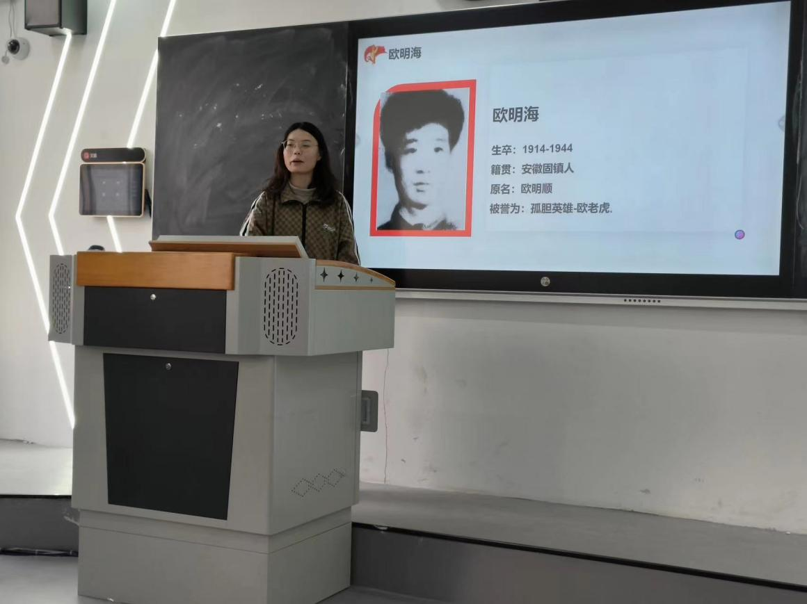 第二党小组成员汤雨欣,深情地讲述了抗日英雄欧明海的主要事迹。1938年5月,安徽固镇、任桥沦陷后,欧明海率领20多名青年携带枪支、马匹,加入抗日游击队,此后凭借自己的机智勇敢与日军展开了艰苦卓绝的斗争。欧明海对敌人英勇不屈,以高尚的人格、年轻的生命,呐喊出了红色革命精神。