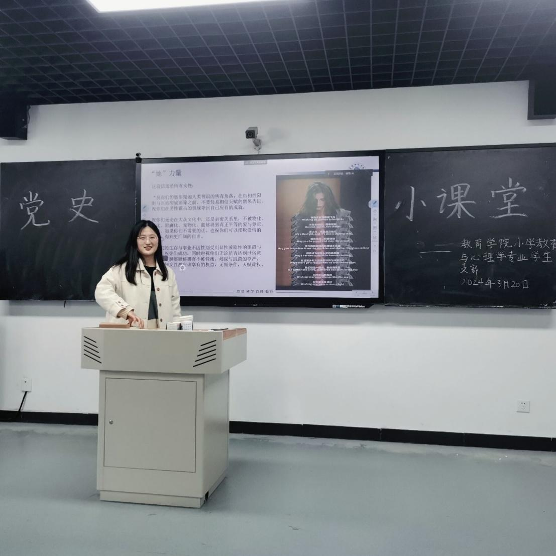 为更好激发学生学党史、知党情、感党恩、跟党走的爱国热情,3月20日下午,小学教育与心理学专业学生支部在西湖三区Z楼310教室开展“讲述巾帼英雄故事 凝聚学子奋进力量”党史小课堂活动。支部全体党员、入党积极分子参加此次活动。