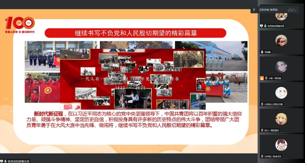 会议开始,张思奇向与会同学展示中国共青团成立一百年的风雨兼程,介绍党领导下的中国青年运动,一代代的中国青年栉风沐雨、砥砺前行,走上一条不平凡的奋斗之路,不断凝聚青年力量,始终坚定不移听党话、跟党走。会议过程中,张思奇向与会同学深入阐述如何成为一名合格优秀的青年马克思主义者,了解党的发展历程与辉煌成就,明确新时代青年工作的前进方向。会议最后,张思奇强调作为一名青年马克思主义者,应主动肩负起新时代赋予青年的光荣使命,甘于奉献火热的青春,踏着坚实的步伐,为加快社会主义现代化建设贡献青春力量,谱写青春华章。