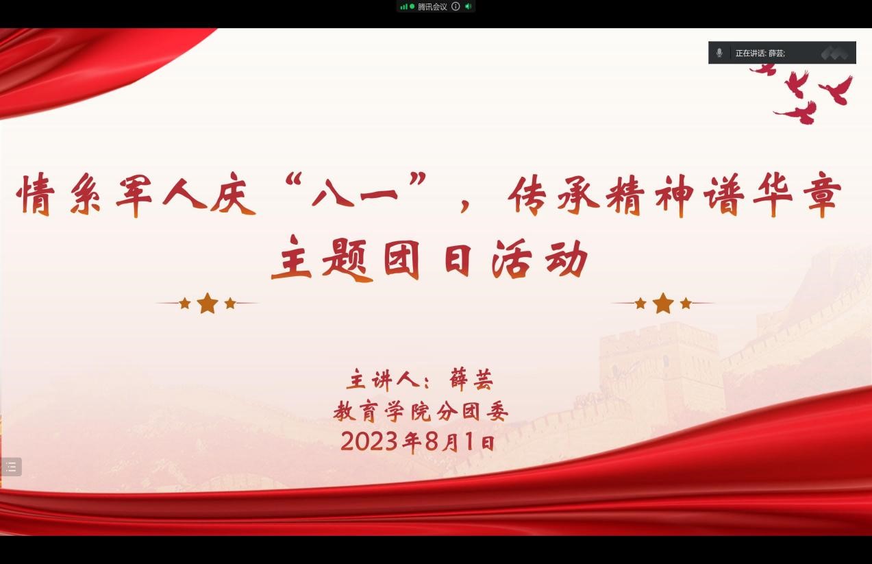 沙场百战行功赏,三军浴血慨而慷。建军96周年之际,为进一步弘扬爱国主义精神,我院分团委于8月1日线上组织开展“八一”建军节主题团日活动,教育学院共四十名团员参与会议。