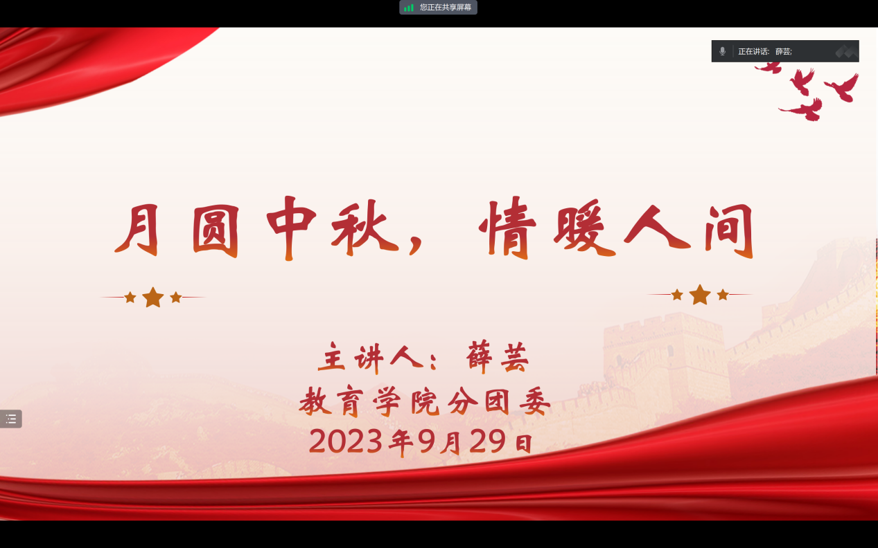 喜迎中秋,共庆佳节,为贯彻落实社会主义核心价值观,继承和发扬中华优秀传统文化,增强学生对于中华传统文化的认同感、归属感和自豪感,我院分团委于9月29日开展庆祝中秋节主题团日活动。我院分团委宣传委员薛芸担任主讲人,共四十余名团干参与会议。