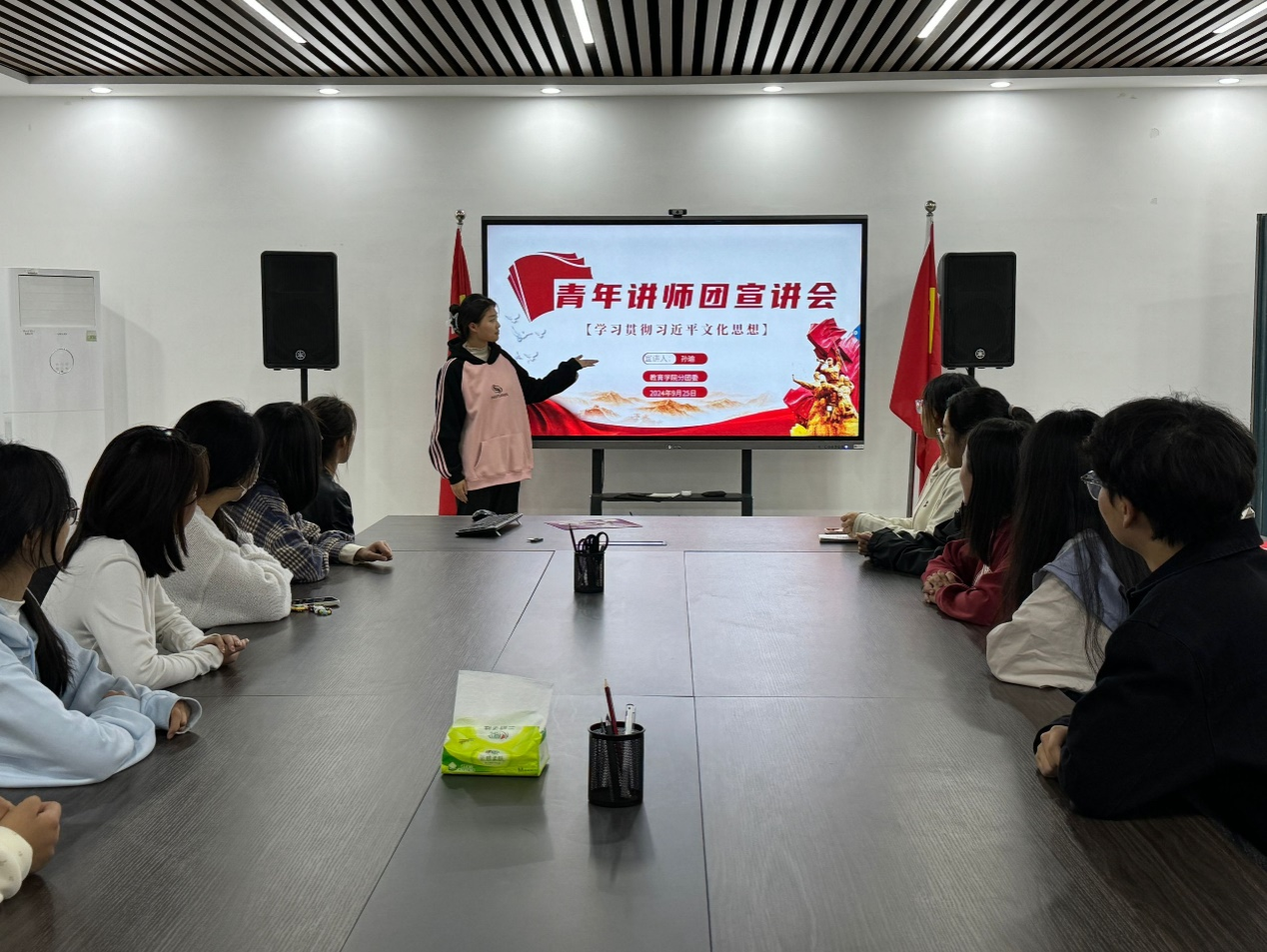 为学习贯彻习近平文化思想,增强我院师生的文化自觉与自信,我院分团委于9月25日在Z楼411会议室开展主题青年讲师团宣讲会。由分团委兼职副书记孙瑜担任宣讲人,共28名团支书参会。