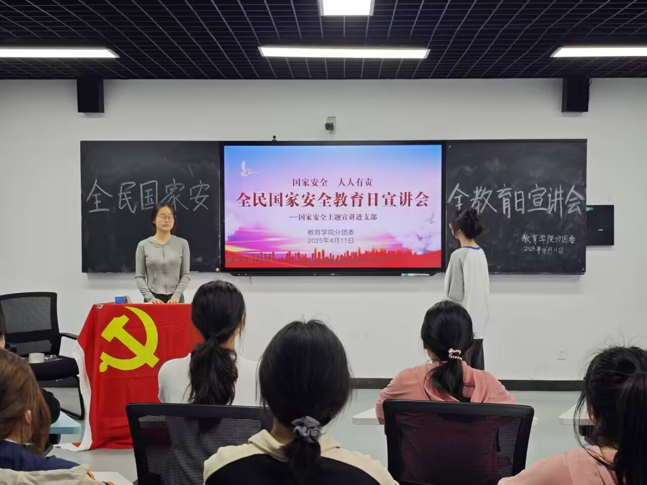 (二)宣讲动员:凝聚青春共识。4月10日,分团委兼职副书记薛芸和孙瑜面向全院团支书召开专题宣讲会暨动员大会。薛芸强调:“青年学生要主动担当维护国家安全的社会责任,将爱国之情转化为守护国家安全的具体行动。”孙瑜结合国际形势和高校实际,剖析了当前国家安全面临的挑战,并指导团支书如何通过团支部活动提升教育实效。