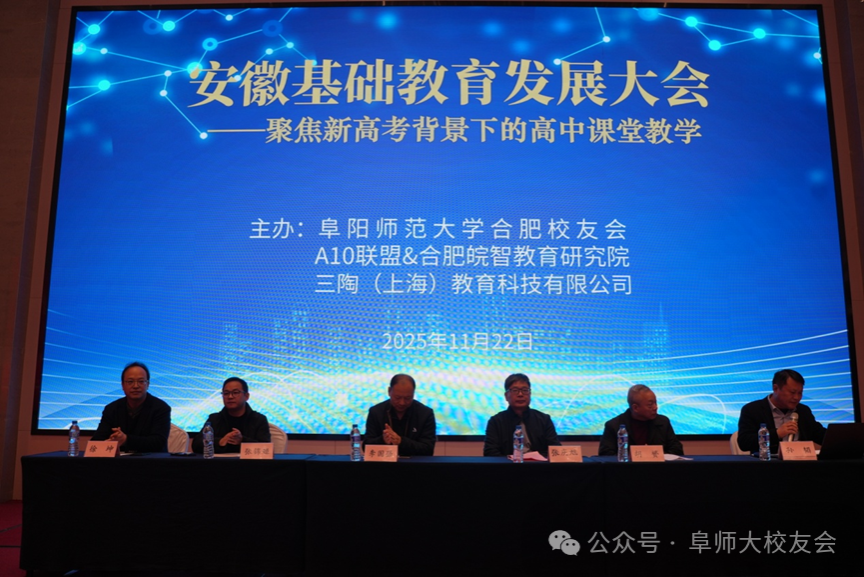 2025年11月22日,由阜阳师范大学合肥校友会联合合肥皖智教育研究院与上海三陶教育共同主办的“安徽基础教育大会”在合肥召开。来自全省的教育专家、一线校长、骨干教师及阜阳师范大学校友齐聚一堂,围绕安徽基础教育高质量发展的路径展开深入交流。