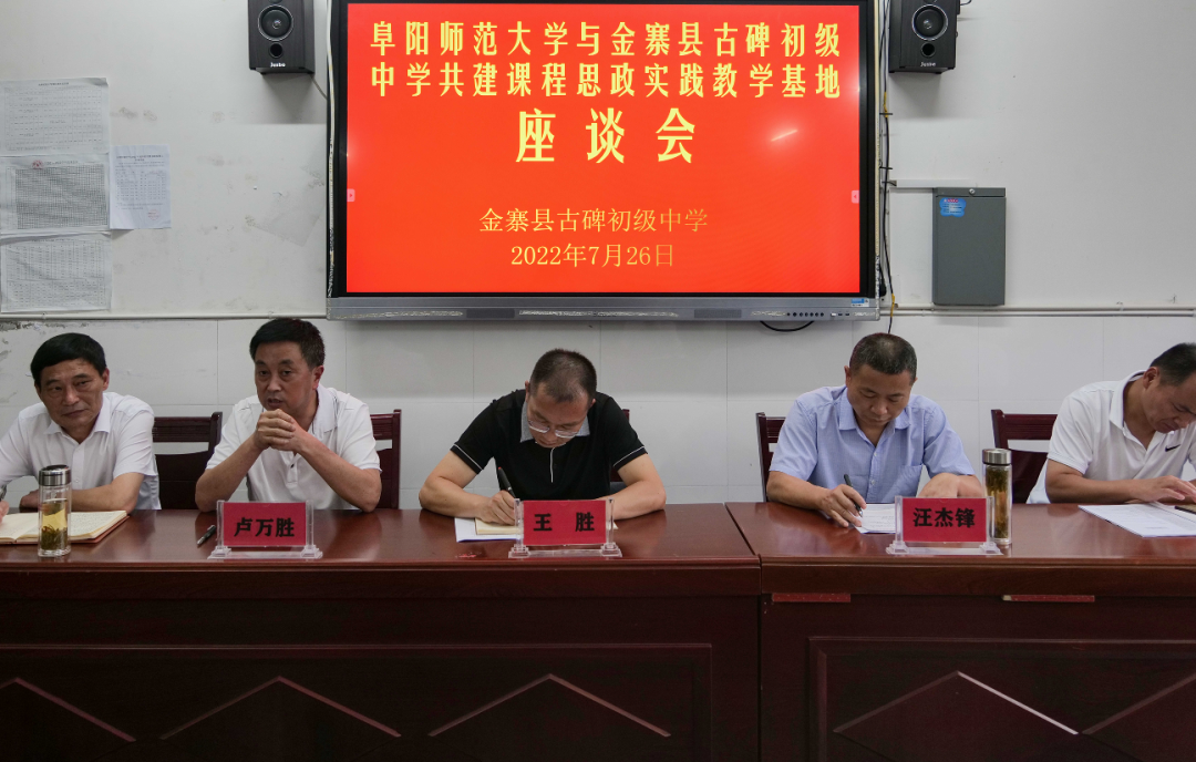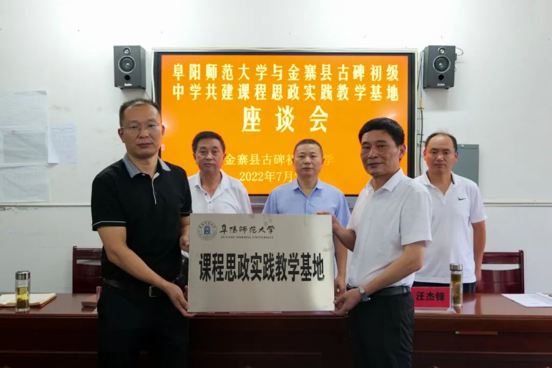为贯彻落实习近平总书记在学校思想政治理论课教师座谈会上的讲话精神,构建大中小学思政育人的新平台。2022年7月26日,阜阳师范大学与古碑初级中学共建课程思政实践教学基地暨挂牌仪式在古碑初级中学隆重举行,并展开一系列活动。
