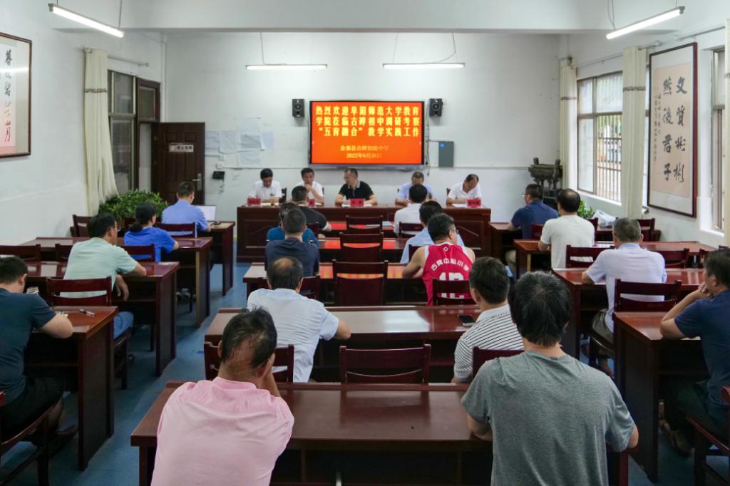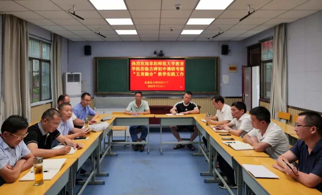 接着由阜阳师范大学教育学院王胜副院长介绍到古碑初级中学调研考察五育融合教学实践工作。调研团队先后观摩了古碑初级中学五育融合汇报课,听取了古碑初级中学关于《构建“五育融合”课程体系,深化“幸福六艺”课程实施》的构想汇报,并结合古碑初级中学推进“五育融合”的现实状况,分别就“五育融合”的基本内涵、课堂教学、课程构建、实施策略等方面的内容进行了互动研讨。