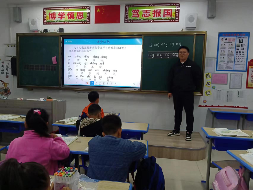 11月10日上午第一节课,六安市将军路小学教师周勇执教一年级的《ang eng ind ong》一课,阜阳市语文名师刘琪听课并指导。周老师紧抓本课时目标为正确认读ang eng ing ong ying,读准音,认清形,会书写。她通过以下环节展开教学:第一,通过复习旧知,导入新课,进行声母、单韵母、复韵母、前鼻韵母和整体认读音节的复习,为学习新知做铺垫。第二,通过观察课文插图、范读、顺口溜读、发音方法教学、多种形式的读等方式,帮助学生读正音。第三,过观察拼音的相同点,带出后鼻韵母,并利用顺口溜来区分eng与ong的发音。第四,通过观察拼音所占的位置和紧凑性,教师范写学生书空,最后在学生临写,教师巡视指导的方式,学习书写。第五,利用小儿歌进行课堂总结,方便同学记忆。第六,展示新儿歌,让学生利用所学知识找出后鼻韵母。