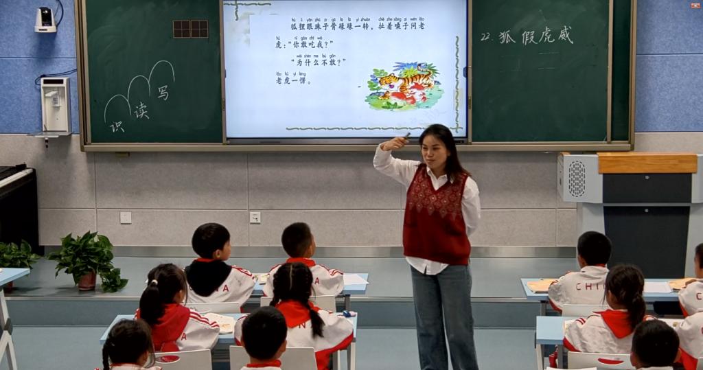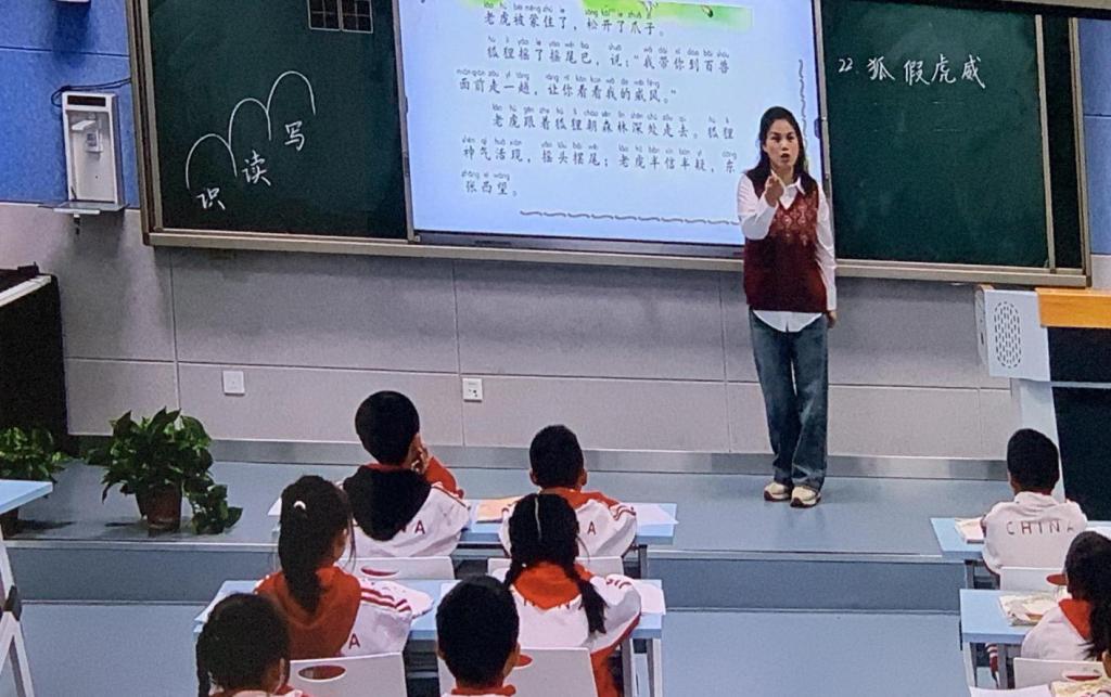 11月10号下午第一节课,阜阳市莲池小学刘琪执教二年级上册22课《狐假虎威》第一课时。她引导学生借助多种识字方法自主识字,在把课文读通读顺的基础上理解“狐假虎威”这个成语的意思。教学中她紧扣语言训练,培养了文化自信,提高了孩子的思维能力和审美创造。在教学内容板块的安排中,分为三个任务群,一、识字环节引导学生对语言文字进行了梳理;二、读文后理解成语的意思体现了实用性阅读与交流;三、表达对故事人物的看法恰恰是思辨性阅读与交流的呈现。