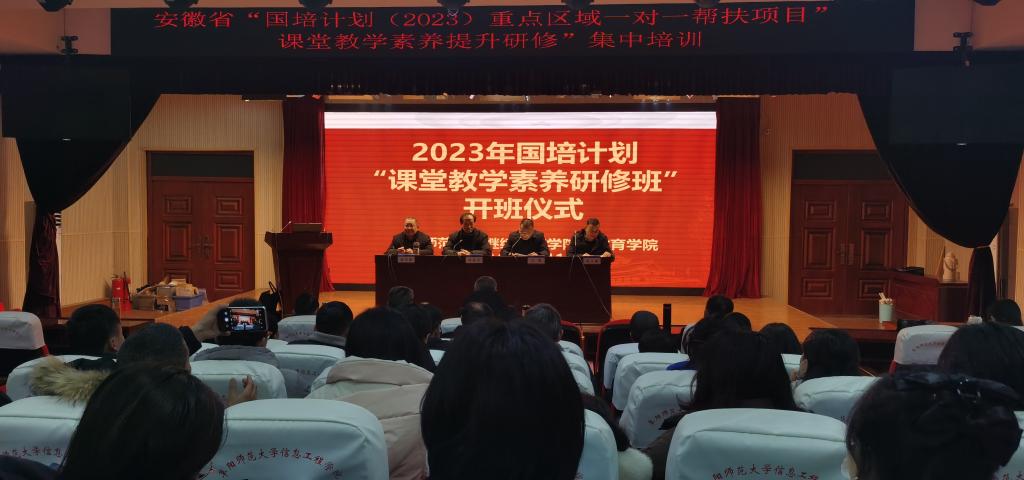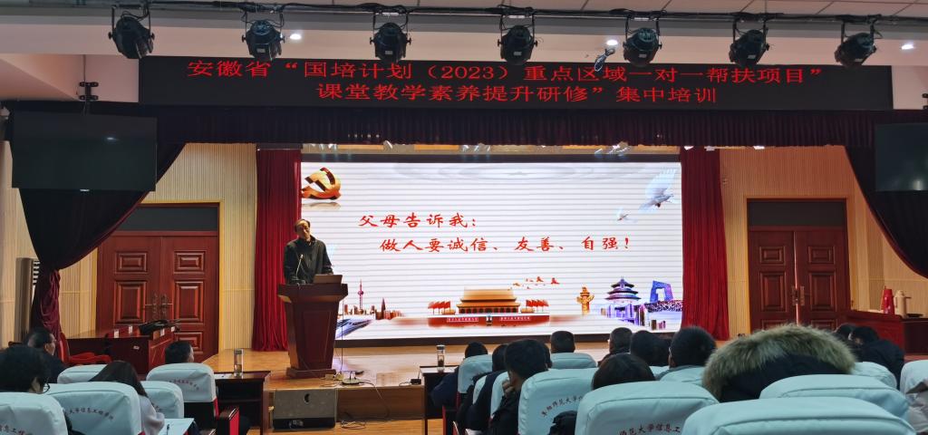 2024年1月11日,由阜阳师范大学承办的安徽省“国培计划(2023)”重点区域“一对一”精准帮扶项目“课堂教学素养提升”研修班在清河校区报告厅举行开班仪式,阜阳师范大学继续教育学院院长高思杰致辞并讲话,培训班负责人徐安银对学员学习做了详细安排,班主任于铭代表班主任团队做了班级纪律与管理的发言,学员代表金寨县古碑初级中学卢健校长做了表态发言,96名骨干学员参加仪式,仪式由教育学院副院长王胜主持。