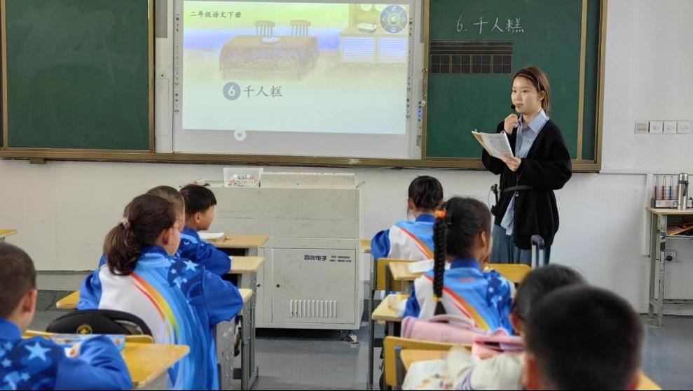 学员陈蓝蓝在二年级执教《千人糕》。陈老师以她独特的魅力,深深地吸引着每一个学生。尽管刚走上讲台一年,但她已经可以站稳讲台,他的教学风格独树一帜,备受赞誉。她以饱满的热情和无尽的耐心,细心地引导着每一个学生,让他们能够在轻松愉快的氛围中快乐地学习、自信地成长。