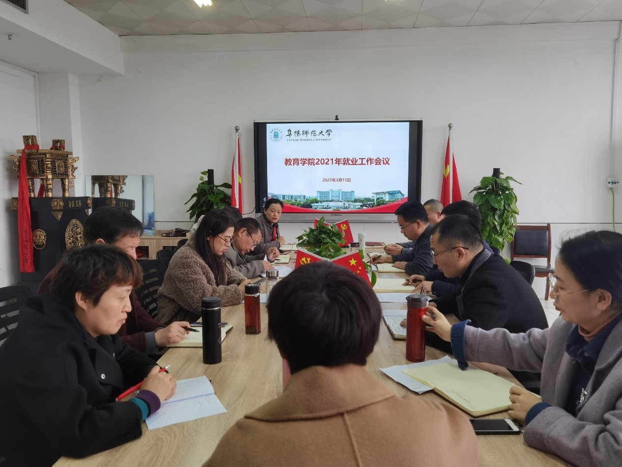 3月15日下午,教育学院在景行楼802会议室召开2021年就业工作会议。会议由党委书记魏文霞主持,学院党委委员、党支部书记、教研室主任、毕业班辅导员等参加会议。