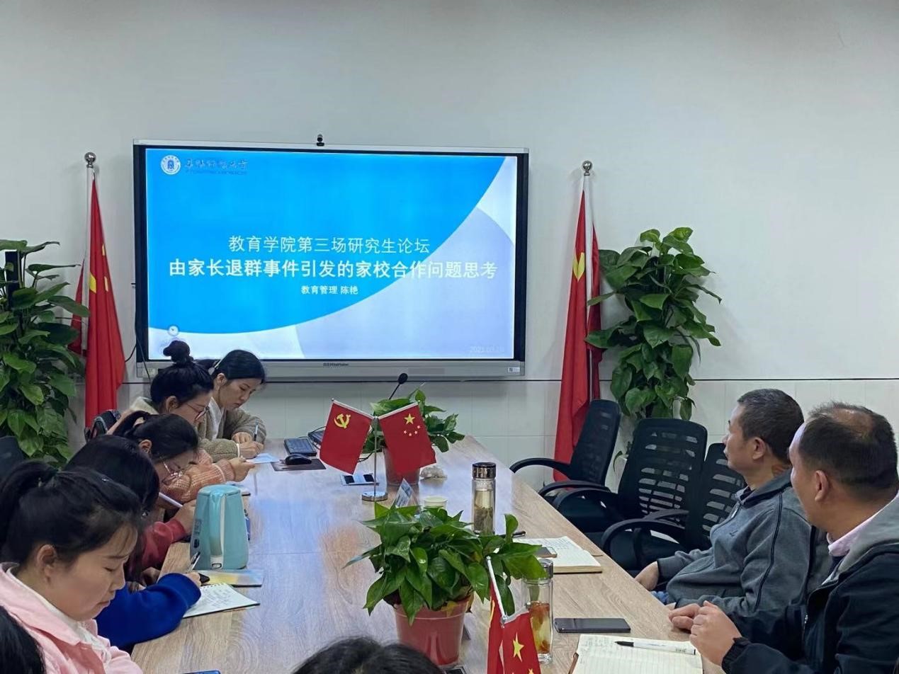 为展示研究生学习成果,增强研究生实践能力和创新意识,4月7日晚,教育学院于景行楼802会议室举办了第三期“研究生学术沙龙”活动。此次沙龙的主题是“由家长退群事件引发的家校合作问题的思考”。教育学院硕士研究生导师汪杰锋、张中原及全体20级教育管理研究生参加沙龙活动。