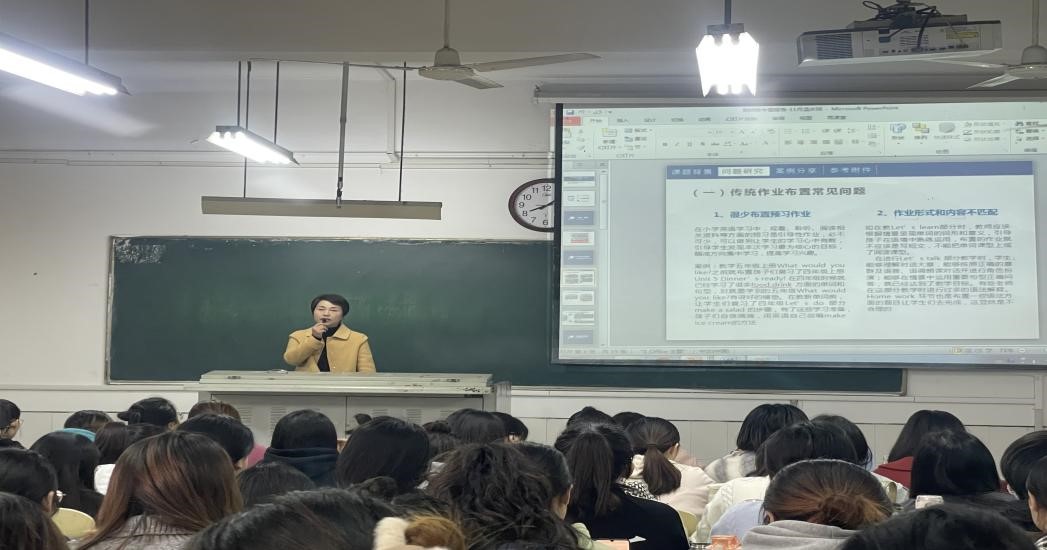 18日上午的讲座主题是:“双减”背景下小学英语作业设计的感悟和分享,由莲池小学温庆同老师从政策解读入手,针对“双减”背景下教师教学观念与方法所面临的现实挑战,温老师认为不仅需要教师提高课堂教学质量,而且需要在作业布置方面直面问题、潜心研究、分层设计。温庆同老师结合自己的实际经验,就传统作业布置常见问题、“双减”背景下作业设计需要面临的新问题等进行了案例分析,并适时分享了有关学生作业设计与批改视频、英语情景剧表演视频,提出了基础型、拓展型、实践型作业设计与评价的改进思路。
