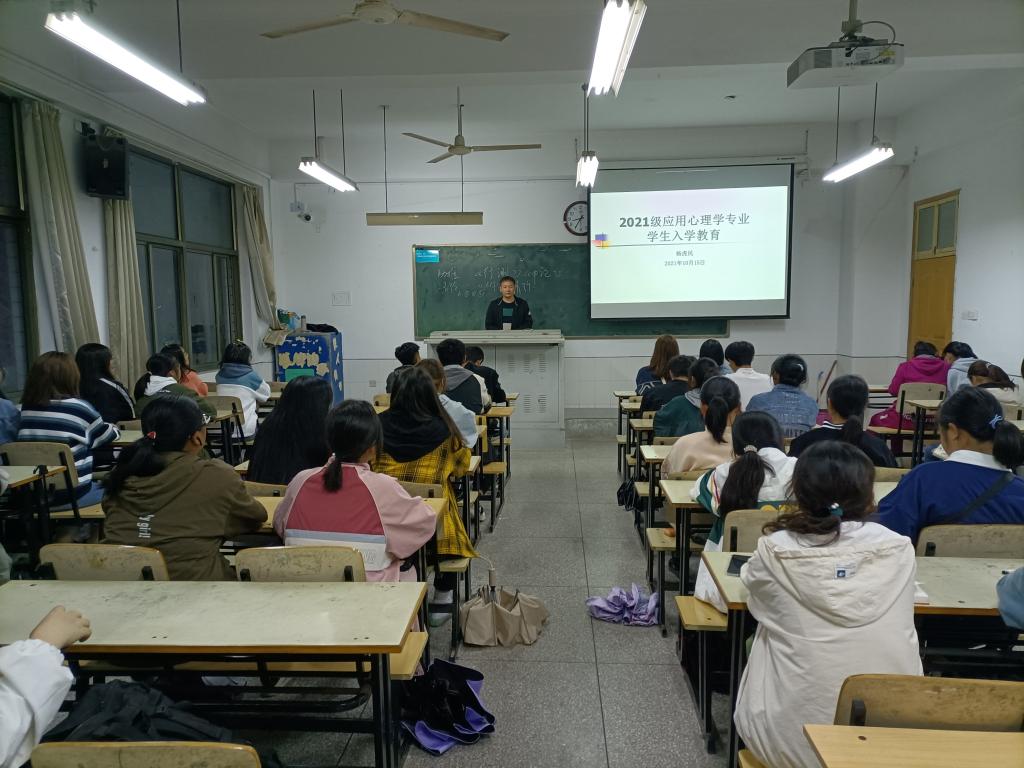 10月15日晚上,教育学院杨虎民教师在西湖校区主楼410教室为2021级应用心理学专业新生开展入学教育。杨虎民分别从心理学专业发展概况、大学生职业规划、如何做人以及如何学习等方面对新生进行入学教育。