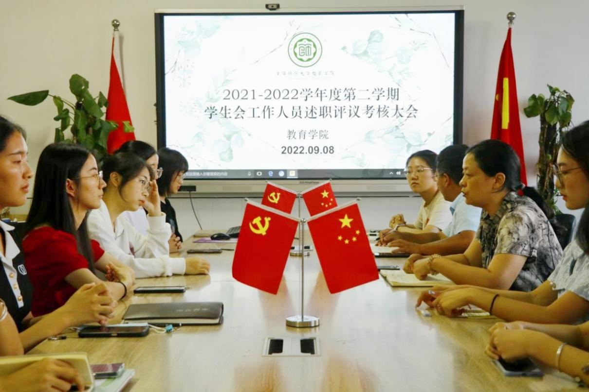 为认真落实好基层团建工作责任制,推进学院学生会高效改革,加强绩效评价与总结反馈,我院于9月8日在景行楼802举办2021-2022学年度第二学期学生会工作人员述职评议考核会。考核会由分团委负责人张思奇主持,教育学院党委书记魏文霞、副书记葛西强参会。