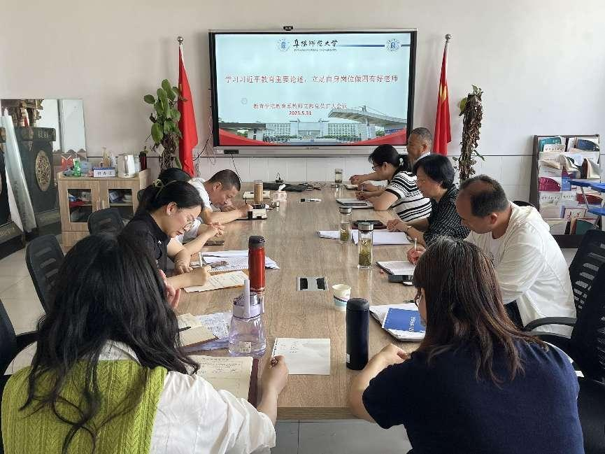 为扎实推进学习贯彻习近平新时代中国特色社会主义思想主题教育走向深入,5月31日下午,教育系教师支部召开党员扩大会议,学院党委书记参加会议并做了《学习习近平教育重要论述,立足自身岗位做“四有”好老师》的党课。