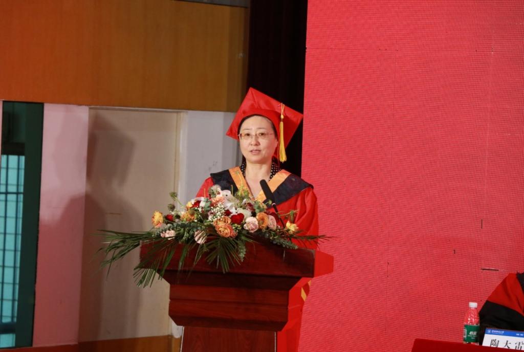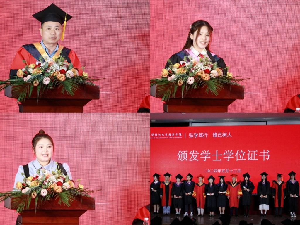 紧接着,2024届毕业生代表黄语鑫同学在发言中祝福莘莘学子在毕业后前途光明,梦有所成,以更加昂扬的姿态,去迎接人生新阶段,鼓励同学们要继续扎实本领,勤劳苦干,刻苦学习。与时代接轨,不负韶华,在工作中不忘拼搏,在社会中绽放光芒。在校生代表唐雨晴衷心祝愿毕业生们不忘初心,以校训“厚德,博学,自胜,勤行”、院训“弘学笃行,修己树人“来勉励自我,保持对知识的热爱,对生活的热情,对未来的信念,坚定的迈向远方。