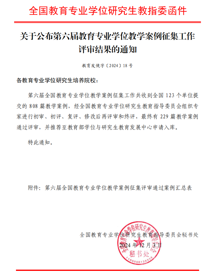 案例教学是专业学位研究生培养的重要手段,案例库的构建则是专业学位发展和教育改革的核心任务及有效途径。此次,我院的案例成功入选,标志着我院在教学案例建设方面取得了新突破。未来,我院将以此为契机,进一步强化优质案例资源的培育、推广和应用,不断提升教育硕士专业点和教育学科的建设水平,确保研究生教育质量的持续提升。