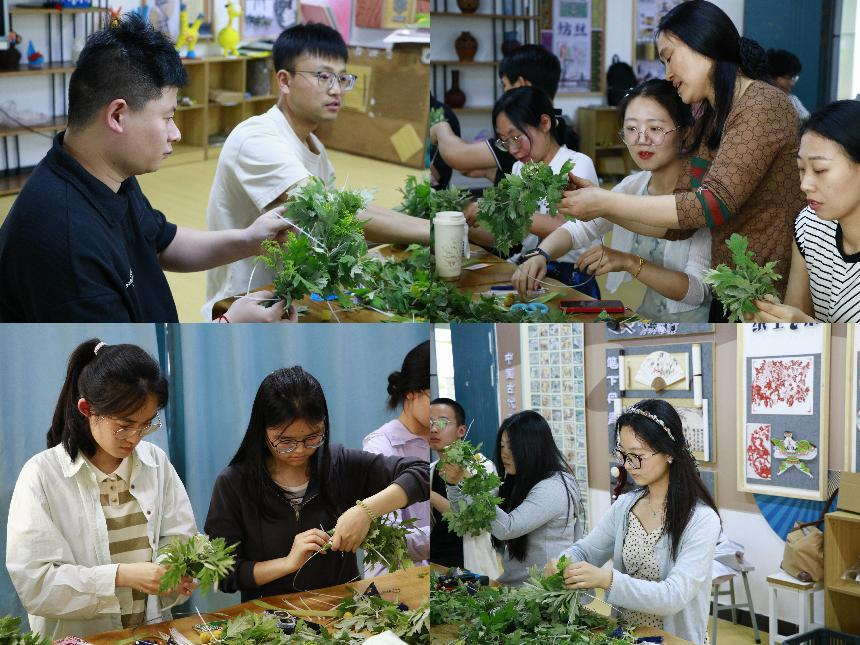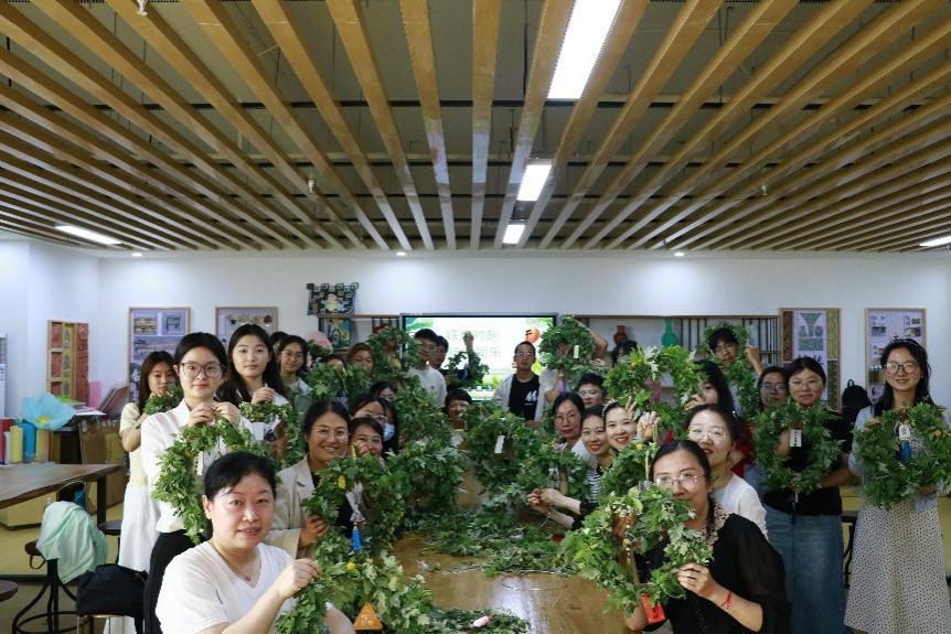 活动伊始,师生们围坐一起将铺陈开来的新鲜艾草编织成一个个端午花环,将美好的祈愿编织进去,这一个个花环不仅是植物的芬芳,更是对健康平安的共同期盼。随后,伴随着馥郁的粽香弥漫开来,大家剥开粽叶品尝着香甜的粽子,大家分享着不同风味的粽子,交流着家乡的端午习俗与生活点滴。最后大家共同举起制作的花环一起拍照留念,记录下美好的瞬间。