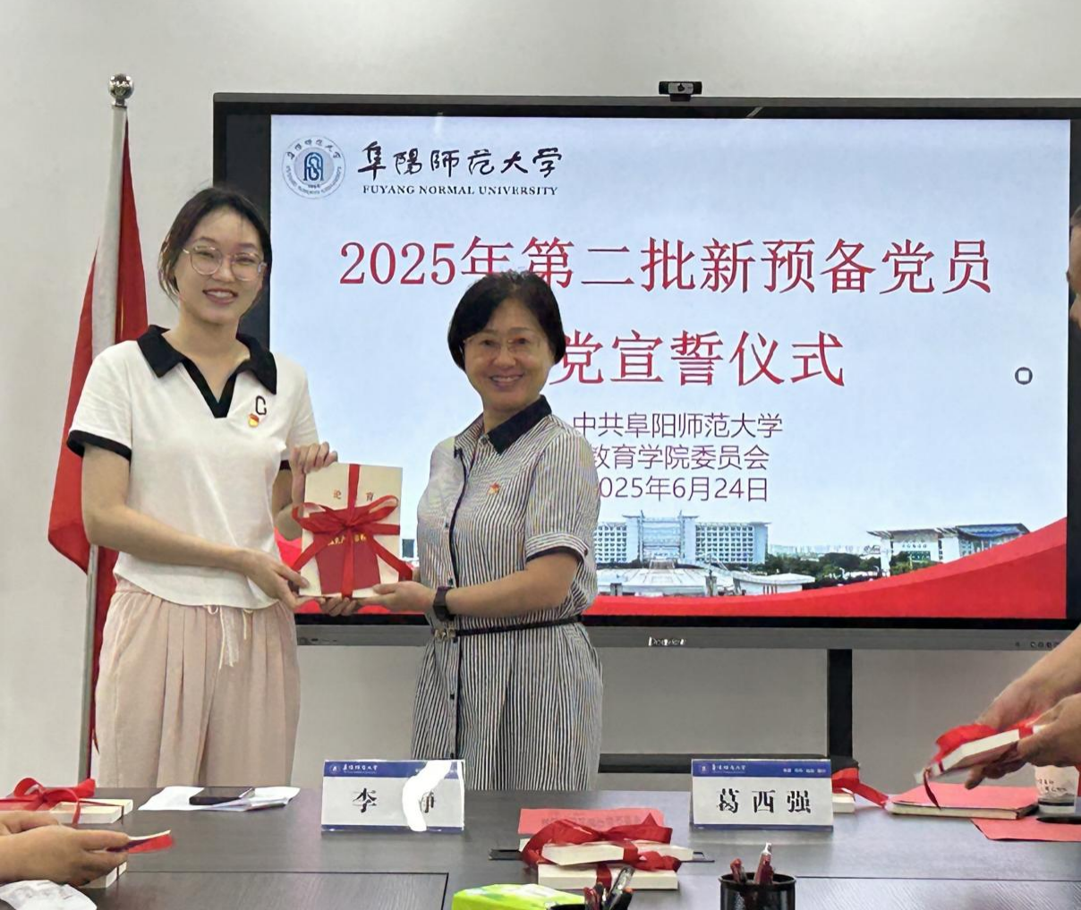 接下来李书记逐一向新发展党员发放《党章》、《习近平论教育》等党员教育图书。在李静书记领誓下,全体党员同志字字铿锵,句句千钧:“我志愿加入中国共产党,……随时准备为党和人民牺牲一切,永不叛党”。铮铮誓词表达了他们对党的无限忠诚和为共产主义事业奋斗终身的坚定决心。