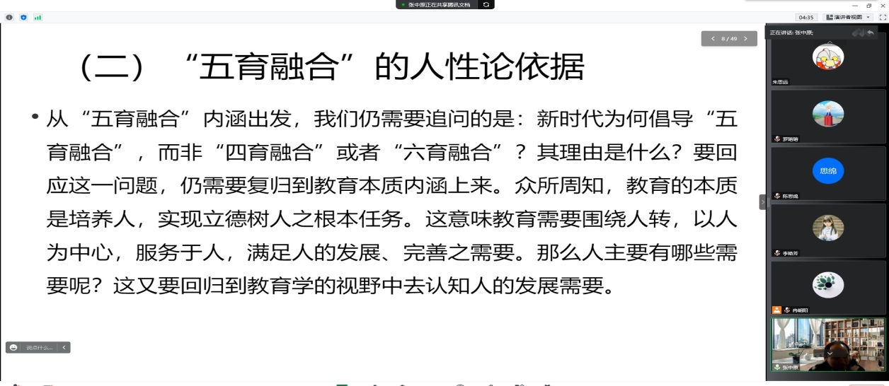 张中原主要围绕“五育融合”的时代意蕴、五育融合的异化表征和五育融合的人性化策略三方面内容展开的。报告内容详实阐述了五育融合中各育的价值目标、独立育人功能,以及它们形成合力,发挥融会贯通的整体综合育人的价值取向与实践路径。尤其是针对当下“应试教育”所造成的负面效应,进行了条分缕析解剖,找出其产生的内外条件并进行归因,并在此基础上,提出了解决问题的可行性策略。