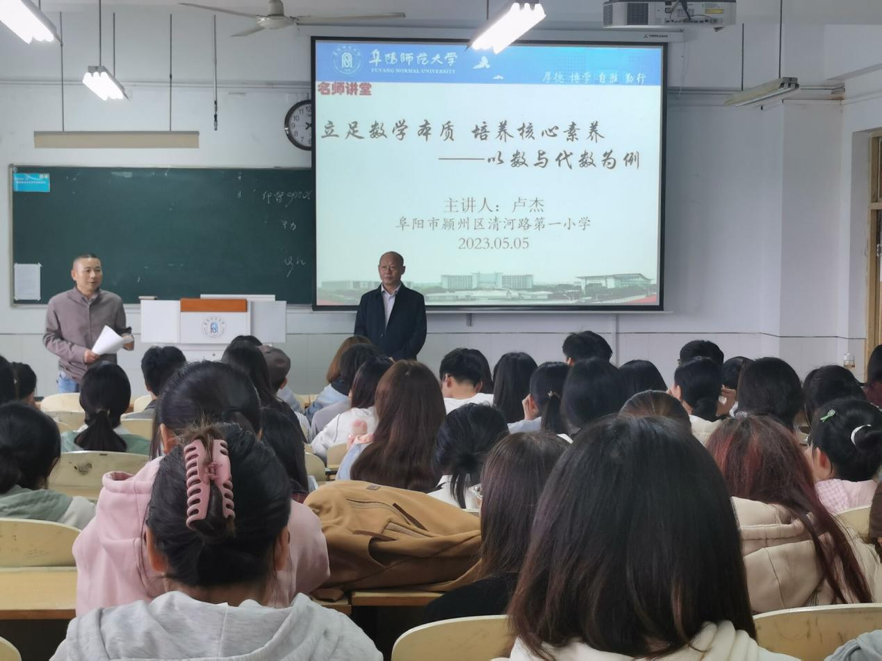 为全面推进我院小学教育省级一流专业建设,有序谋划专业认证整改工作,进一步提高新时代师范生专业核心素养发展水平。5月5日下午,我院特邀阜阳市清河路第一小学特级教师、数学学科带头人卢杰老师做客“名师名校长讲坛”,本次讲座的主题是:立足数学本质,培养核心素养。讲座由小学教育系汪杰锋教授主持,小学教育系主任高艳军及2020级、2021级小学教育专业师范生共100余人参与听会。