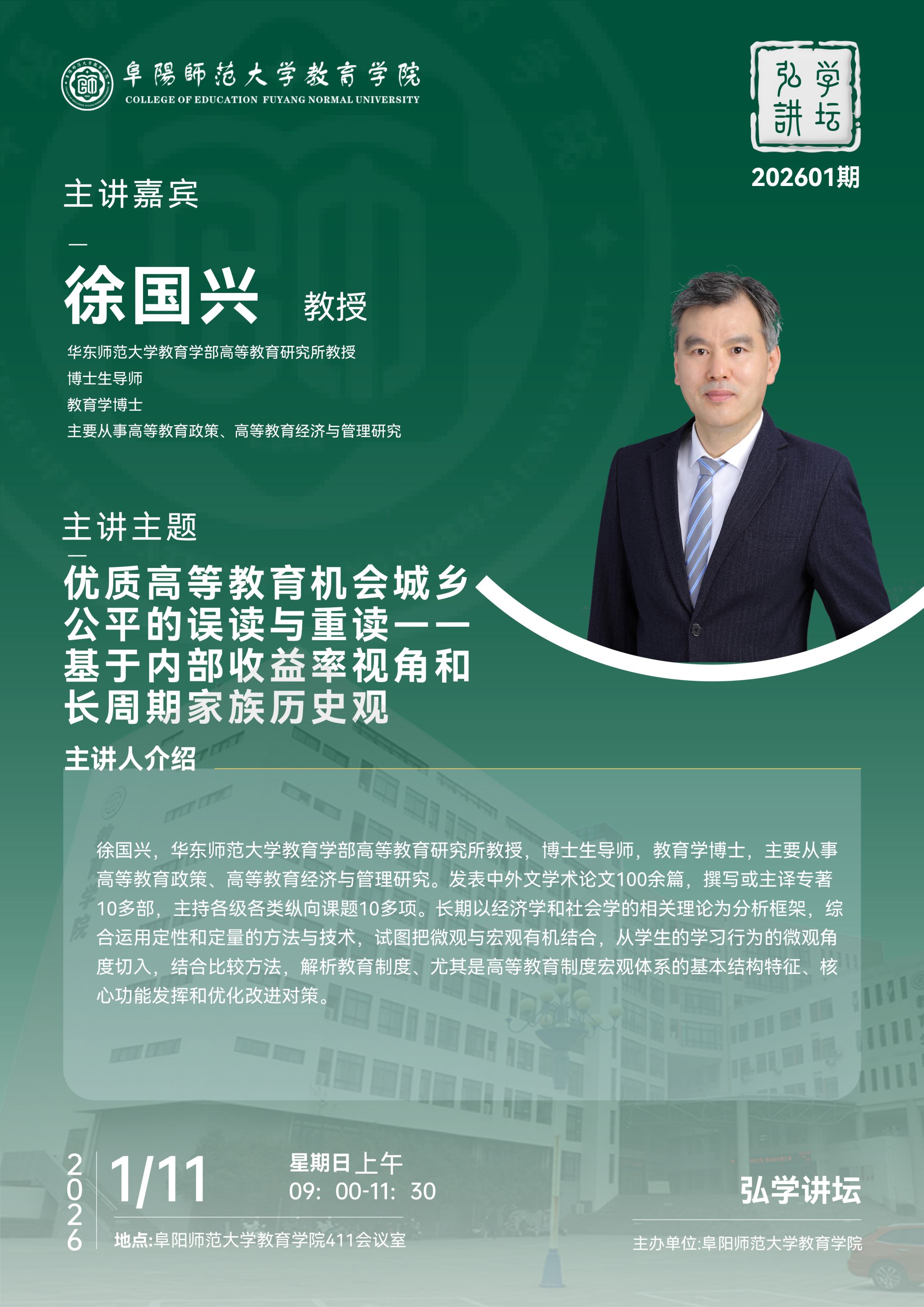 【弘学讲坛 202601期】-徐国兴 优质高等教育机会城乡公平的误读与重读——基于内部收益率视角和长周期家族历史观