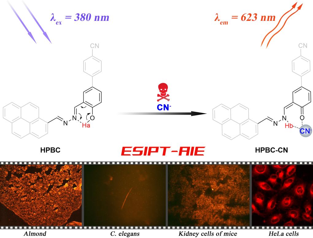 众所周知,氰化物(CN-)是一种剧毒物质。发展一种快速准确检测氰化物的方法是环境检测和生命医学领域的迫切需求。课题组通过巧妙的设计和简便的步骤合成得到了一个新荧光探针分子。ESIPT和AIE特性的有效结合,促使该探针分子实现了对CN-高灵敏度和专一性识别,并获得高达243 nm的Stokes位移值,提高了对CN-的生物成像质量和检测水平。通过多种测试手段深入研究了识别机制,并且该探针在食品检测和生物成像等实际应用中表现优异。该研究为进一步设计新型CN-荧光探针分子提供了新的思路。论文链接:https://doi.org/10.1016/j.cej.2022.136445