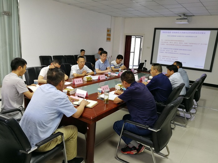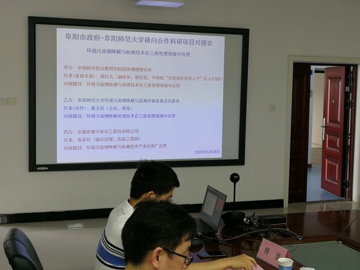 2020年5月28日下午,阜阳市政府—阜阳师范大学横向合作科研项目对接会在我校环境污染物降解与监测安徽省重点实验室会议室召开,就环境污染物降解与检测技术在三废处理领域中的应用进行对接。校科研处处长张丙开主持会议。