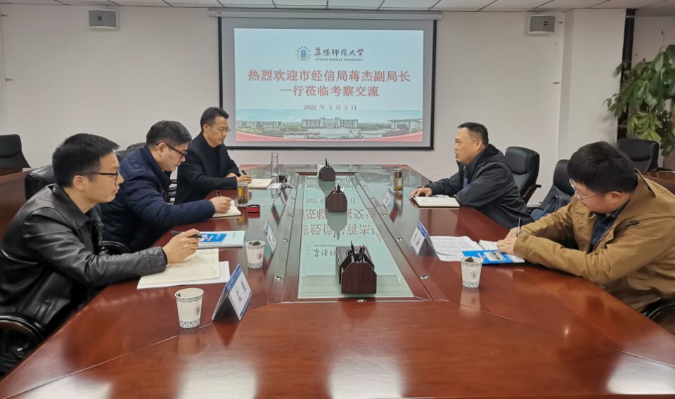 张庆旭对蒋杰来校交流表示欢迎。他从我校历史沿革、发展定位、人才培养、科研成果等方面介绍了学校推进高水平师范大学建设的工作举措。他表示,学校有服务地方的殷切愿望、迫切心情和饱满的精神面貌,希望以此次互动为新的契机,在市校合作选题、研究发展定位、学科发展方向等方面与市经信局开展全方位的合作,通过产业链等“面上”校地合作、重点项目突破等方式,以更加积极主动的姿态融入阜阳地方经济社会的发展,开创学校与地方经济相互促进、共赢发展的崭新局面。